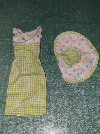 Conjunto de ropa para muñeca vintage Barbie. REF: #1649 (Almuerzo en la terraza). ESTADO SEGÚN FOTOS. Si tienes cualquier duda o necesitas mas fotos, no dudes en ponerte en contacto conmigo. SE ACEPTAN OFERTAS O CAMBIO POR CROMOS O ALBUMES DE FÚTBOL ANTIGUOS como todos mis lotes. Más ropa en mi perfil BARBIE MIDGE MATTEL. - Vestido con estampado de puntos de colores y falda a cuadros. - Sombrero a juego con estampado de puntos y borde a cuadros.