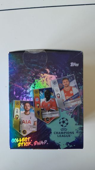 Caja sin abrir de sobres de cromos de la colección Topps Champions League 22/23 (Stickers). La caja contiene 50 sobres sin abrir de 10 cromos cada uno. Total: 500 cromos. Precio NO NEGOCIABLE. Ya está bastante ajustado. Se puede entregar en mano en Alcorcón o Suanzes (Madrid).