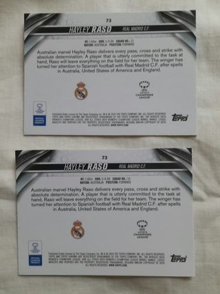 Cromos UEFA Women's Champions League 2023 24 Topps Chrome. Hayley Raso N°73 (Real Madrid) ×2. Hago envío por correo ordinario o Wallapop. Acepto pago por bizum. 4€ más gastos de envío.