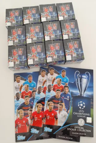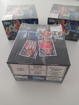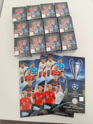 Lote de 12 cajas precintadas de cromos Topps de la UEFA Champions League stickers 2015 2016. Cada caja contiene 50 sobres con 5 cromos en cada uno. Incluye 3 álbumes plancha sin cromos pegados.