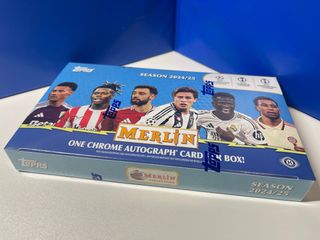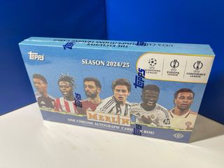 Caja de cromos Topps Merlin de la temporada 2024/25, edición UCC Hobby. - Contiene 1 carta One Chrome Autograph por caja. - Ilustraciones de jugadores de fútbol de la temporada 2024/25. - Incluye logos de la UEFA Champions League, Europa League y Conference League.
