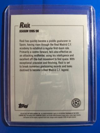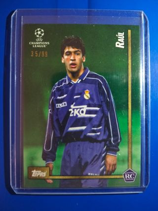 Carta coleccionable de Raúl, jugador del Real Madrid. - Edición limitada numerada 35 de 99. - Incluye el logo de Champions League. - Marca Topps. - Sello RC (Rookie Card).