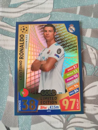 Carta coleccionable de Cristiano Ronaldo, edición limitada Gold de Topps Champions League. - Jugador: Cristiano Ronaldo - Edición: Gold Limited Edition - Equipo: Real Madrid - Posición: Delantero - Valoración de Ataque: 97 - Puntuaciones: Velocidad 87, Táctica 33, Potencia 90, Disparo 97, Habilidad 94, Pase 84 - Número: 38 - Marca: Topps - Precio: €15m