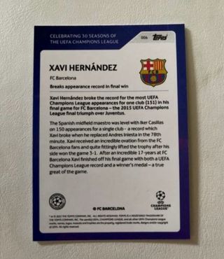 Colección de Topps 30 aniversario Champions League Xavi Hernández Barcelona. Conmemorativa de ser el jugador con más apariciones en un club Justo en la final de 2015 Ficha numerada 35/49 En perfecto estado Se entrega en mano en madrid Palabras clave: panini adrenalyn limited edition liga mundial Eurocopa balón de oro card edición especial Camiseta este megacracks blister sobre álbum Gift box starter pack gold Silver cromos cards Rookie Megacracks Messi Ansu Fati cristiano Ronaldo Ronaldinho Topps now living set Match Attax extra