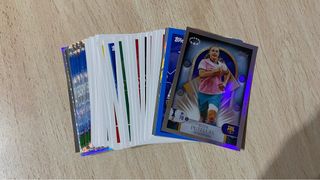 Colección de cromos de fútbol Adrenalyn XL de la temporada 2025-2026. Incluye varias cartas de Balón de Oro y Champions. - Cromos de jugadores como Carvajal, Julián Álvarez y otros. - Cartas con diferentes estadísticas y diseños. - Ideal para coleccionistas y aficionados al fútbol.