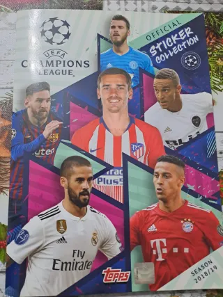 Álbum oficial de la UEFA Champions League de la temporada 2018/19 completo de la marca Topps. Contiene imágenes de jugadores destacados. - Incluye jugadores como Messi, Griezmann, De Gea, Isco y Thiago. - Diseño con los escudos de la UEFA Champions League y Topps. - Portada con el logo de la colección oficial de cromos.