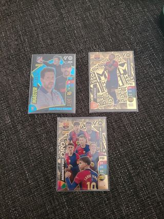Colección de cromos Panini Adrenalyn XL de la temporada 2025/2026, con temática de la Champions League. Se venden por separado Preguntar por precios de cada carta y por faltas de la coleccion - Incluye cromos de Míticos Invencibles y Champions. - Cromos con acabados Oro Puro y 40 EA Sports. - Números de cromo visibles: 101, 101, 101, 303, 76, 89, 100, 265. - Referencias: 468, 2024, 2025.