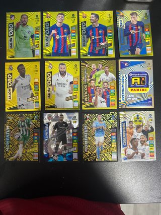 Colección de cromos de fútbol Panini de la temporada 22-23. Incluye varios jugadores destacados. - Cromos de la colección Panini 22-23. - Jugadores como Oblak, Pedri, Lewandowski, Vinícius, Benzema, Joaquín, Unai Simón y Iago Aspas. - Incluye cromos de las series Balón de Oro, Míticos, Momentum y Champions. - También se incluye un cromo de Premium Oro Panini Card On-Line. vendo también sueltas consultar al chat