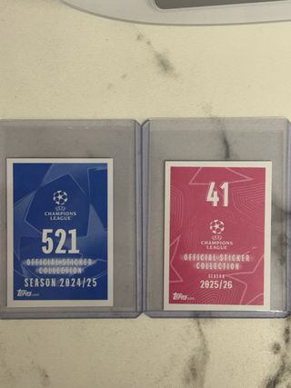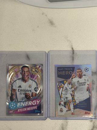 Dos cromos de Kylian Mbappé de la colección UEFA Champions League. - Cromos de la temporada 2024/2025 - 2025/2026. - Incluye cromo 'Energy' y cromo 'Hat-Trick Hero'. - Ambos cromos son de la marca Topps.
