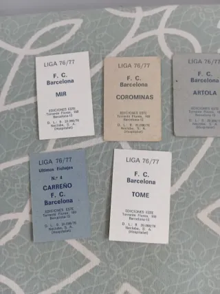 Colección de cromos de jugadores del F.C. Barcelona de la temporada 1976/77. - Cromos de jugadores como Mir, Corominas, Artola, Neeskens, Carreño y Migueli. - Incluye el cromo de Últimos Fichajes N.4 de Carreño. - Editados por Ediciones Este.