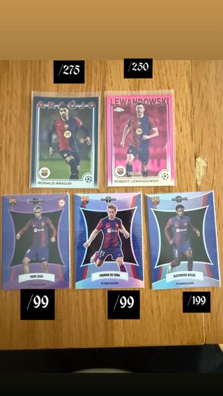 Conjunto de 5 cromos de jugadores del FC Barcelona, todos ellos numerados. - Ronald Araújo /275 - Robert Lewandowski /250 - Marc Guíu /99 (Rookie Card) - Frenkie de Jong /99 - Alejandro Balde /199 . . . . . . Cromos, PSA, futbol, baloncesto, basket, stephen curry, messi, barcelona, gradeada, 10, lamine yamal, funko pop, exclusivo, coleccionismo, coleccionista, panini, PS5, figuritas, one piece, damon slayer, Pix, F1, pedri, FIFA, NBA, 2k, prizm, auto, patch, parche, numeradas, firma, autografo, premier league, arsenal, liverpool, PSG, argentina, focus, maradona, deco, DAKA, chrome, Fermin
