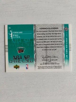 Tarjeta de colección de Pau Gasol con el equipo Memphis Grizzlies. - Incluye un parche con trozo de camiseta usada por el jugador en partido de la NBA - Diseño con el logo de los Grizzlies. Combina con otros cromos de mi perfil y ahorra en los gastos de envío Envío a través de Wallapop, posibilidad de envío ordinario (1,50€) o entrega en mano en Ensanche de Vallecas No leer: panini patch card parche auto carta numerada jersey nba lakers psg cromo topps futera autografo firma simplicidad original match worn game used messi cr7 nazario maradona lamine yamal mbappe bellingham real madrid barcelona jordan kobe bryant