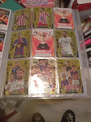 Colección de cromos Panini Adrenalyn XL. - Incluye cromos de jugadores como Lamine Yamal y Karim Benzema. - Cromos especiales como 'Campeón Card', 'Extra Gold' y 'Balón de Oro'. - Algunos cromos son de edición limitada o de alta puntuación.
