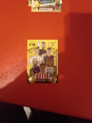 Cromo de la colección Card Atómica de Panini y EA Sports. - Diseño con acabado dorado. - Ilustración de varios futbolistas. - Incluye detalles de jugadores y estadísticas.