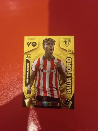 Cromo de la colección Panini de Nico Williams, edición Balón de Oro. - Diseño dorado. - Incluye escudo del Athletic Club. - Número de coleccionista: 469.
