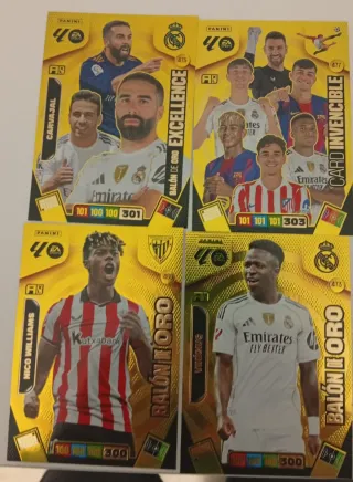 Colección de cromos Panini Adrenalyn XL de la temporada 2026. - Cromos de jugadores como Carvajal, Nico Williams y Vinícius. - Incluye cromos de las categorías 'Balón de Oro', 'Excellence' y 'Card Invencible'. - Cada cromo muestra estadísticas numéricas.