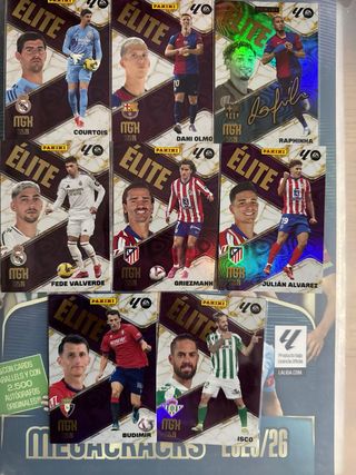 Colección de cromos Panini Megacracks de la temporada 25/26. Incluye 8 cartas Élite de jugadores como Courtois, Dani Olmo, Raphinha, Fede Valverde, Griezmann, Julián Álvarez, Budimir e Isco. - Cromos Élite. - Cartas conmemorativas. - Incluye 2.500 autógrafos originales.
