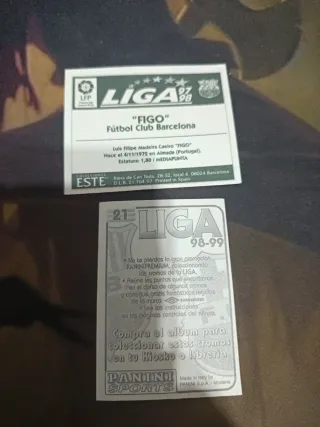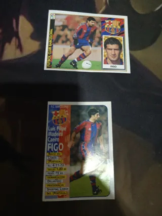 Colección de cromos de Luis Figo del FC Barcelona, correspondientes a las temporadas 97-98 y 98-99 de Panini. - Incluye dos cromos del jugador. - Uno de ellos muestra al jugador en acción con el FC Barcelona. - El otro es un retrato del jugador. - Información del jugador: Nombre completo, fecha y lugar de nacimiento, altura, peso, demarcación y procedencia.