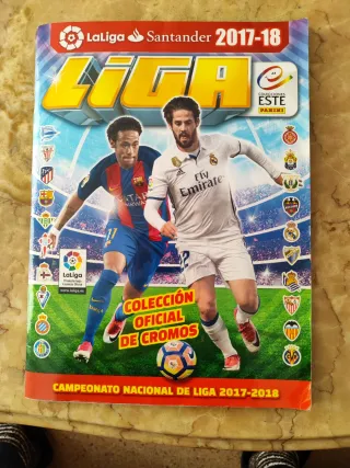 Álbum de cromos oficial de LaLiga Santander Este de la temporada 2017-18. Tiene todos los equipos Completos,un cromo como mínimo por casilla. Dispone de 490 cromos Los 40 escudos-entrenadores Los 320 básicos Más 46 dobles o colocas Los 26 Stars Los 11 dobles escudos de segunda 40 últimos fichajes de 64 Los 7 puzzle Además se dan 24 cromos en sus hojas de los fichajes del Mercado de Invierno,ver las fotos. Todo por 22€ más envío por Wallapop o entrega en mano