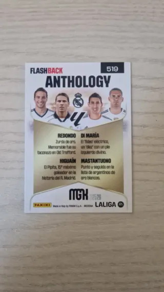 Cromo de la colección Flash Back Anthology de Panini. - Jugadores: Higuaín, Redondo, Mastantuono, Di María. - Edición: Medios. - Temporada: 2025/26.