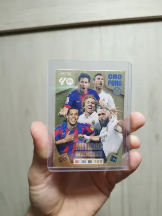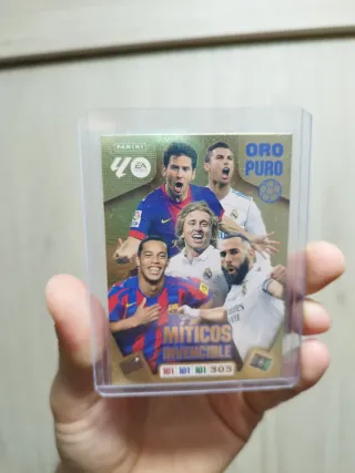 Cromo de fútbol Panini Oro Puro. - Presenta a jugadores míticos e invencibles. - Incluye los números 101, 101, 101 y 303.