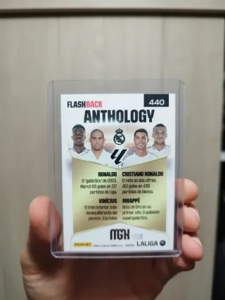 Coleccionable de EA Sports Flash Back Anthology. - Presenta a los jugadores Vinicius, Ronaldo, Mbappé y Cristiano Ronaldo. - Diseño con temática de Delanteros. - Incluye el logo de Panini.