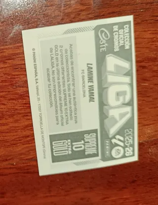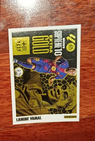 Cromo de fútbol Extra Gold de Lamine Yamal. - Edición especial Panini. - Diseño con detalles dorados. - Imagen del jugador en acción.