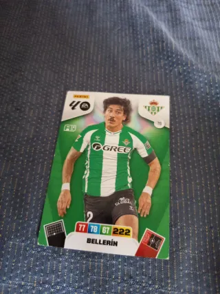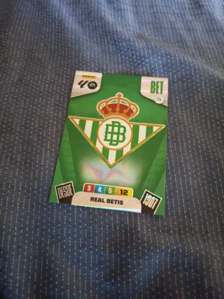 Cromo de fútbol del Real Betis. - Edición XL. - Incluye escudo del equipo. - Con estadísticas del jugador.