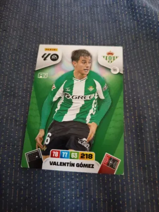 Cromo de fútbol Panini Adrenalyn XL. - Jugador: Valentín Gómez - Equipo: Real Betis Balompié - Número: 6 - Valoración: 78-77-63-218