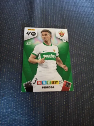 Cromo de fútbol Panini Adrenalyn XL. - Jugador: Pedrosa - Número: 3 - Estadísticas: 74, 76, 67, 217 - Club: Elche CF (según escudo) - Edición: XL