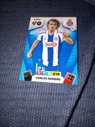 Cromo de fútbol Panini Adrenalyn XL. - Jugador: Carlos Romero - Número de cromo: 134 - Equipo: RCD Espanyol de Barcelona - Estadísticas: Ataque 77, Defensa 77, Control 64, Velocidad 218 - Dorsal: 22