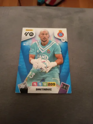 Cromo de fútbol Panini Adrenalyn XL del jugador Dmitrovic. - Número de jugador: 13 - Puntos: 79, 78, 52, 209 - Club: RCD Espanyol - Temporada: 2020-2021