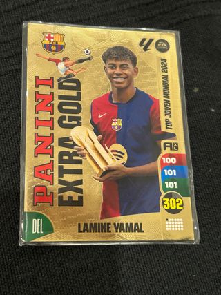 Cromo de Lamine Yamal de la colección Panini Extra Gold. - Edición: Top Joven Mundial 2024. - Incluye las estadísticas del jugador. - Diseño dorado y llamativo.