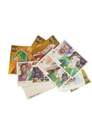 Lote de cromos de la Liga Panini 2019/2020. -El lote incluye 100 cromos de distintos equipos algunos cromos repetidos entre si. - Incluye cromos de jugadores como Ter Stegen, Modric, Benzema, Dembélé y Fede Valverde. - Cromos de la Serie Oro.