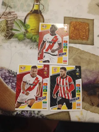 Lote de tres cromos de fútbol de la colección Panini de la temporada 2022-2023. - Cromo de Mumin. - Cromo de Falcao. - Cromo de Muniain.