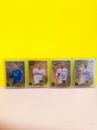 Colección de 4 cromos de Cristiano Ronaldo de la colección Panini Dynasty. - Cromos de edición limitada. - Incluye los cromos de las temporadas 2012-13 y 2015-16. - Diseño dorado con detalles de alta calidad.