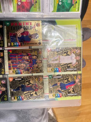 Colección de cromos Panini de la temporada 2024-25. - Incluye cromos de la serie Extra Gold. - También incluye cromos de la serie Momentum. - Cromos de jugadores como Lamine Yamal, Fede Valverde, Raphinha y Lewandowski.