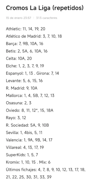 Colección de cromos de la Liga Panini. - Cromos de equipos como Alavés, Athletic Club, Atlético, Barça, Betis, Celta, Elche, Espanyol, Getafe, Girona, Levante, Madrid, Mallorca, Osasuna, Oviedo, Rayo, Sevilla, Valencia y Villarreal. - Incluye cromos de Super Kids, Mistero Cero y Mix. - También se incluyen Últimos Fichajes y una lista de números. - Los números listados son: 8, 15, 16, 4, 18, 20, 2, 3, 17, 14, 19, 13, 10, 15, 16, 14, 3, 10, 13, 3, 14, 2, 3, 8, 10, 17, 4, 5, 9, 10, 14, 19, 12, 18, 2, 4, 11, 13, 19, 5, 7, 11, 26, 3, 6, 11, 14, 15, 5, 9, 10, 13, 2, 6, 8, 16, 19, 21, 23, 1, 3, 4, 6, 9, 10, 12, 14, 15, 16, 17, 18, 20, 21,