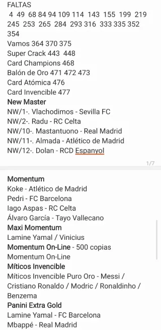 Colección de cromos de fútbol Panini. - Incluye cartas de Adrenalyn XL, FIFA 365 y MGK 25/26. - Cambio por Yamine Lamal Extra Gold ó MOMEMTUM MaxiClásico ó Etta Eyong De Adrenalyn. También busco MOMEMTUM Yamine Lamal de FIFA 365. - Cromos de jugadores como Mastantuono, Ferran Torres, Gavi, Pedri, Vinicius Jr., Salah y Mbappé. - Cartas especiales: Special One Black, Card Atomica, Panini Extra Gold.