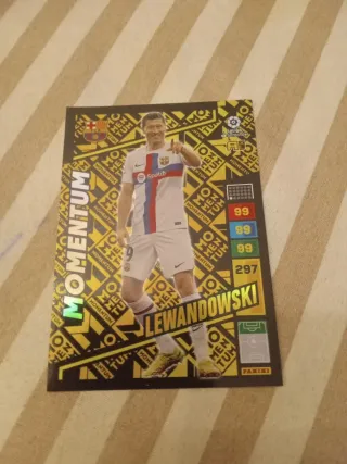 Cromo de fútbol de Robert Lewandowski de la colección Momentum de Panini LaLiga. - Edición Momentum. - Jugador: Lewandowski. - Colección: LaLiga. - Marca: Panini.