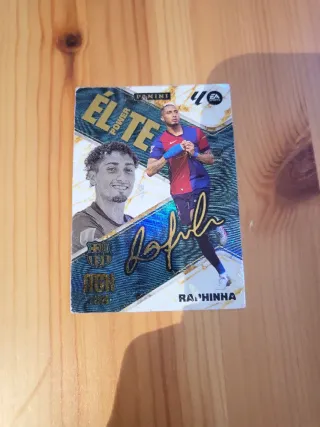 Dos cromos de fútbol de la colección Panini Élite Power. - Cromo de Raphinha. - Cromo de Lewandowski.