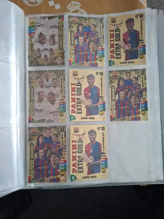 Colección de cromos Panini Miticos y Extra Gold de la temporada 24/25. Incluye cartas de jugadores como Lamine Yamal. - Cromos de la colección Miticos Invencible.25e - Cromos de la colección Panini Extra Gold. 50e - Cartas con detalles dorados. - Incluye jugadores del FC Barcelona.