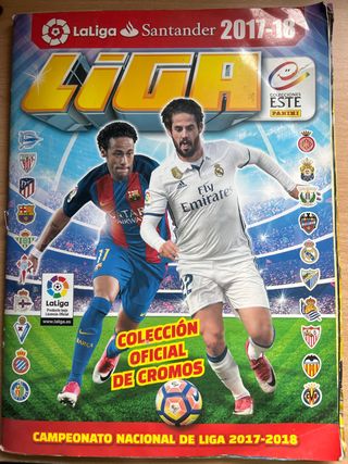 Álbum oficial de cromos de la Liga Santander de la temporada 2017-2018. - Incluye la colección completa de cromos. - Presenta a jugadores destacados de la liga. - Diseño con el logo de LaLiga y Panini.