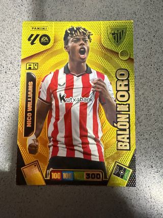 Cromo de fútbol de Nico Williams de la colección Panini Balón de Oro. - Cromo de jugador. - Diseño dorado. - Incluye estadísticas del jugador.