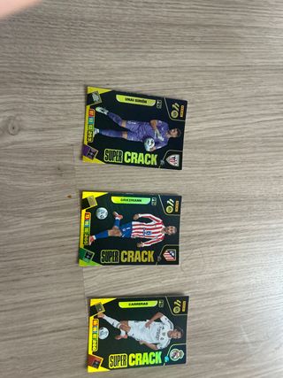 Lote de 3 cromos Super Crack de Panini. - Incluye los cromos de Unai Simón, Griezmann y Carreras. - Cada cromo tiene estadísticas y el logo de Panini.