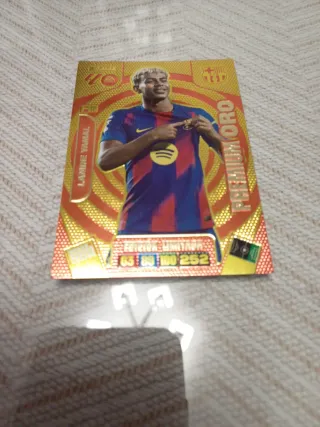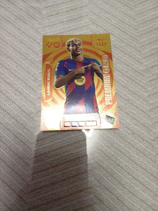 Colecciona este cromo de Lamine Yamal de la colección Premium Oro de Panini. - Cromo de futbolista. - Diseño dorado. - Edición Premium Oro.