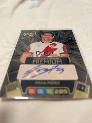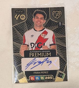 Cromo de colección Panini de Fran Pérez con autógrafo original. - Edición Premium. - Incluye números de estadísticas: 95, 95, 95, 285. - Diseño con detalles dorados y fondo negro. - Plastificada 100% conservada