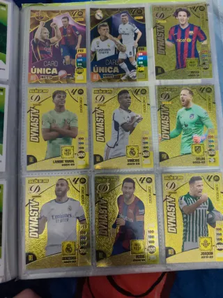 Colección de cromos de fútbol Panini Dynasty. - Cromos de la temporada 2025/26. - Incluye cartas de jugadores como Iniesta, Kroos, Messi, Vinicius, Oblak, Benzema, Joaquín y Lamine Yamal. - Cromos con diseño dorado y detalles de edición única.