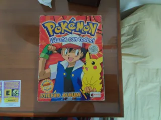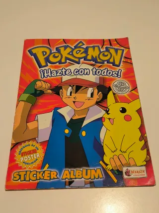 Álbum de cromos de Pokémon, versión original y completo. No incluye el póster. - Portada con Ash y Pikachu. - Título Sticker Album en la parte inferior. - Sello de Merlin Collections.