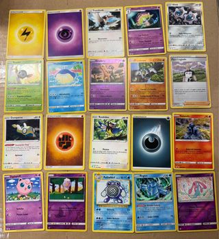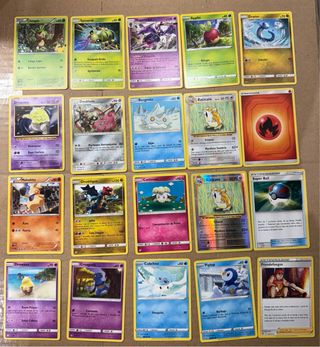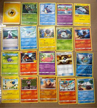 Colección de 40 cromos de Pokémon. - Incluye cartas de Energía. - Cartas de Entrenador. - Diversos Pokémon como Cubone, Ledyba, Zyra, Whismur, Staravia, Meowth, Shiinotic, Cosmog, Chimchar, Stufful, Treecko, Growlithe, Polteageist y Eelektross. - Algunas cartas tienen información de ataque y daño.
